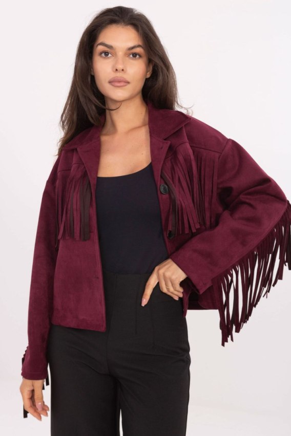 Krótka damska kurtka przejściowa o casualowym charakterze, idealna na codzienne stylizacje. Wykonana z połączenia poliestru i elastanu, zapewnia wygodę i swobodę ruchów. Gładka tkanina została urozmaicona modnymi frędzlami na rękawach, plecach oraz przodzie, co nadaje całości wyjątkowego, stylowego wyrazu. Model z długim rękawem, zapinany na guziki. Kurtka bez ocieplenia, doskonała na sezon jesień, zima oraz wiosna. To efektowny element garderoby, który ożywi każdą codzienną stylizację.