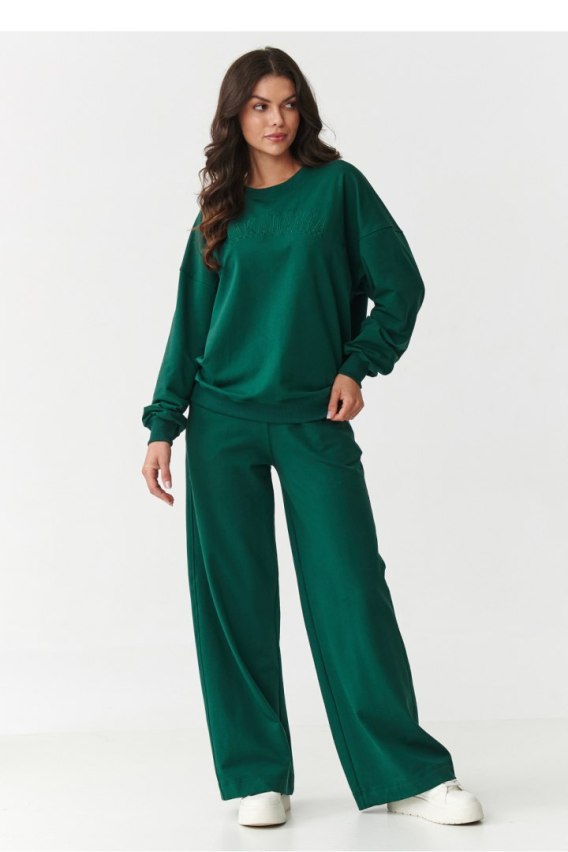 Postaw na połączenie wygody i modnego looku z damskim kompletem dresowym, który idealnie sprawdzi się zarówno na co dzień, jak i podczas luźnych wyjść czy relaksu w domu. Wykonany z miękkiej, oddychającej dzianiny o składzie 95% bawełna, 5% elastan, gwarantuje komfort noszenia i świetne dopasowanie do sylwetki bez krępowania ruchów. Górna część zestawu to klasyczna bluza z okrągłym dekoltem i delikatnie obniżoną linią ramion. Ma lekko oversizowy krój który nadaje stylizacji luzu i nowoczesnego charakteru. Jej wyjątkowość podkreśla haftowana aplikacja z logo na przodzie, która dodaje całości oryginalności i subtelnego stylu. Spodnie wyróżniają się modnym krojem z szerokimi nogawkami, które pięknie układają się w ruchu i nadają sylwetce lekkości oraz równoważą proporcję sylwetki. Elastyczny pas i praktyczne kieszenie zwiększają funkcjonalność i wygodę noszenia. Idealny wybór na każdą porę roku, dres z szerokimi nogawkami i haftem to must-have w kobiecej garderobie. Komfort, jakość i modny wygląd w jednym zestawie!