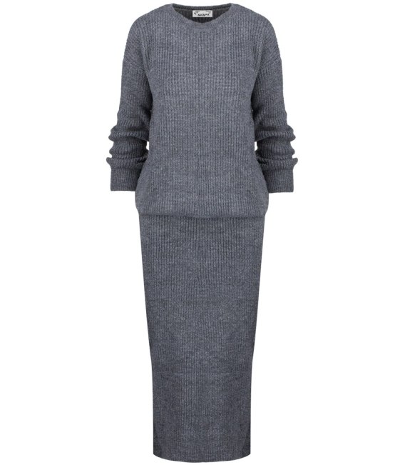Dzianinowy komplet sweter + spódnica w jednolitym kolorze szary