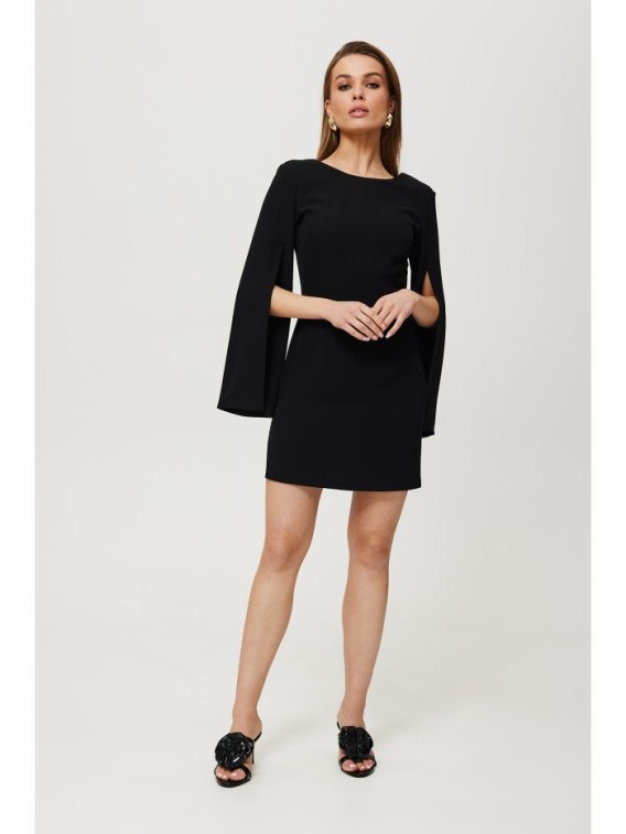 95% poliester 5% elastan INFORMACJE O PRODUKCIE:      tkanina sukienka długości mini fason dopasowany do figury dekolt z przodu okrągły pod szyję z tyłu dekolt V długie rękawy z wysokimi rozcięciami kryty zamek z tyłu bez podszewki nasza modelka ma 174 cm wzrostu i nosi rozmiar S zaprojektowane i uszyte w Polsce