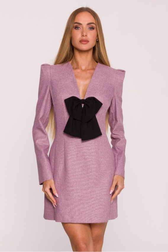 Wyjątkowa sukienka z tkaniny tweedowej w melanżowym wzorze to elegancka propozycja z nutą nowoczesnego charakteru. Strukturalny materiał pięknie układa się na sylwetce, nadając całości szyku i klasy. Model ma głęboki dekolt w kształcie litery V, który subtelnie podkreśla kobiecą sylwetkę. Długie rękawy z lekko poszerzanymi ramionami i bufkami dodają sukience wyrazistości oraz nadają jej modnego, strukturalnego charakteru. Zapięcie na kryty zamek z tyłu zapewnia wygodę i estetyczne wykończenie. Wyjątkowym detalem jest ozdobna dopinka, szyfonowa kokarda z biżuteryjnym wisiorkiem, która nadaje sukience eleganckiego, biżuteryjnego akcentu i sprawia, że prezentuje się jeszcze bardziej wyjątkowo. Fason lekko dopasowany z mocniej zaznaczoną talią podkreśla proporcje sylwetki, a mini długość dodaje całości lekkości i kobiecego uroku. Zaprojektowana i uszyta w Polsce idealna dla kobiet, które cenią klasykę z nowoczesnymi, dekoracyjnymi detalami.