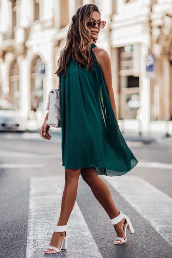 Szyfonowa, zwiewna sukienka z dekoltem typu halter z niewysoką stójką. Trapezowy fason zamaskuje niedoskonałości sylwetki, dzięki temu nasza sylwetka stanie się bardziej atrakcyjna.